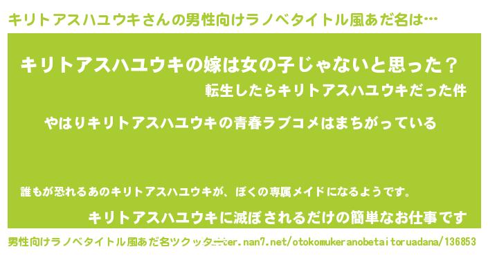 | 女子向けラノベタイトル風あだ名 | 『キリトアスハユウキの雑貨屋さん』 |