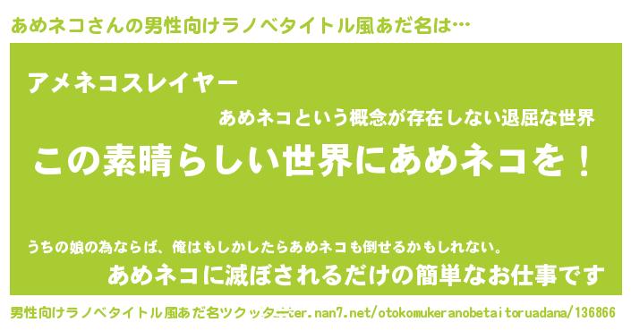 | 女子向けラノベタイトル風あだ名 | 『悪役あめネコに転生したようですが、知った事ではありません』 |
