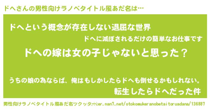 | 女子向けラノベタイトル風あだ名 | 『ドへの卵を拾いまして』『ドへの婚約者』 |