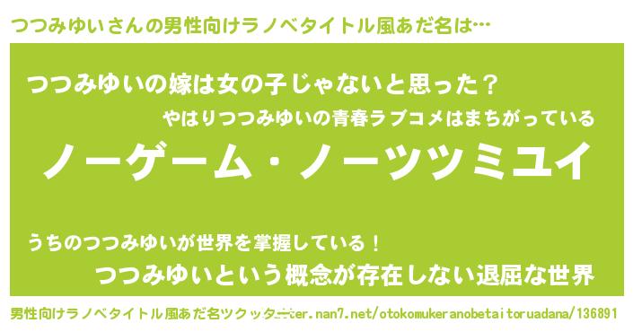 | 女子向けラノベタイトル風あだ名 | 『死神つつみゆいの再婚』 |