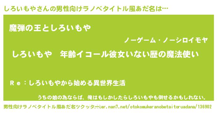 | 胡散臭い通販商品みたいなあだ名 | 『あなたにだけ特別に提供する限定10本のレアな日本酒…その名も「しろいもや」』 |
