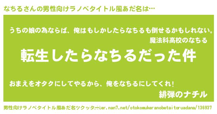 | 意味不明あだ名 | 『たけのこ科なちる属』『自称なちる』 |