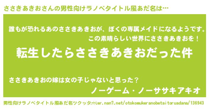 | 女子向けラノベタイトル風あだ名 | 『ささきあきおの玉の輿計画!』 |