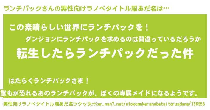 | 女子向けラノベタイトル風あだ名 | 『婚約破棄系悪役ランチパックに転生したので、保身に走りました。』 |