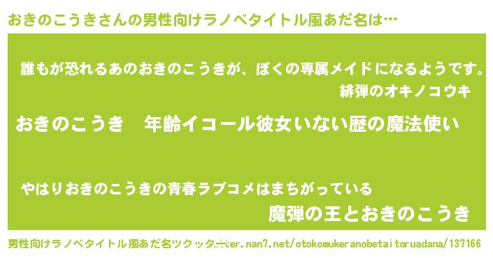 | 女子向けラノベタイトル風あだ名 | 『おきのこうきの玉の輿計画!』 |