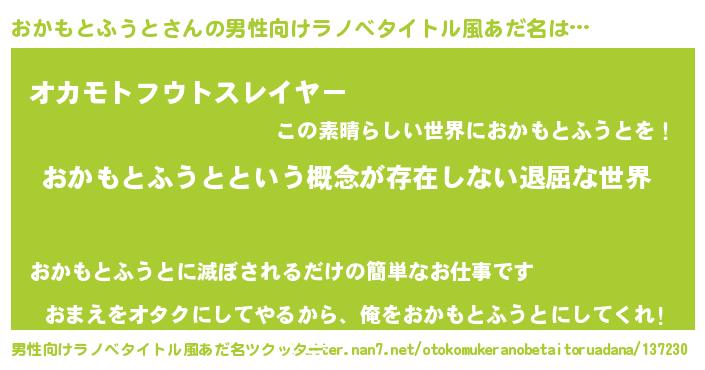 | 女子向けラノベタイトル風あだ名 | 『おかもとふうとの契約王妃』 |