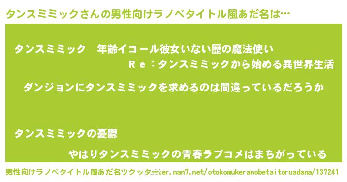 | 女子向けラノベタイトル風あだ名 | 『タンスミミックの卵を拾いまして』 |