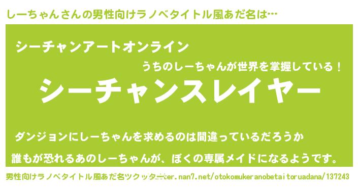 | 胡散臭い通販商品みたいなあだ名 | 『必ず成功するブレスレット…その名も「しーちゃん」』 |