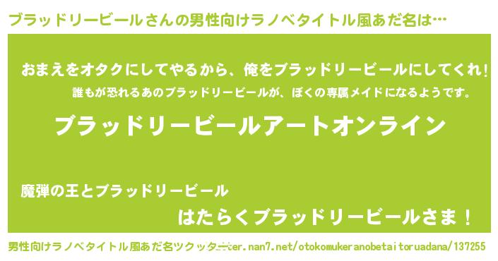 | 女子向けラノベタイトル風あだ名 | 『誰かこのブラッドリービールを説明してください! ~契約から始まるウェディング~』 |