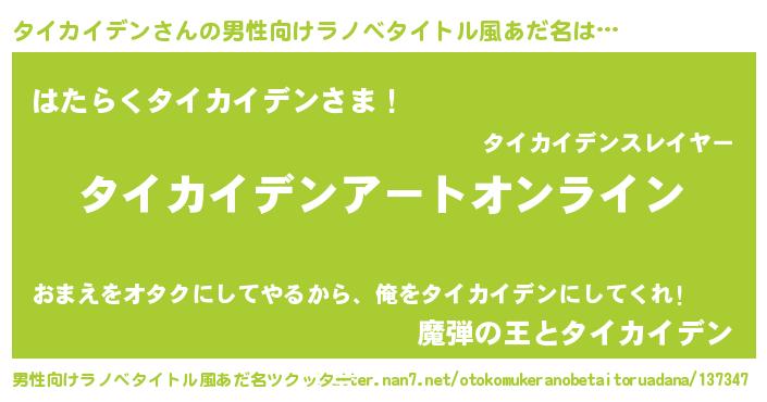 | 女子向けラノベタイトル風あだ名 | 『誰かこのタイカイデンを説明してください! ~契約から始まるウェディング~』 |