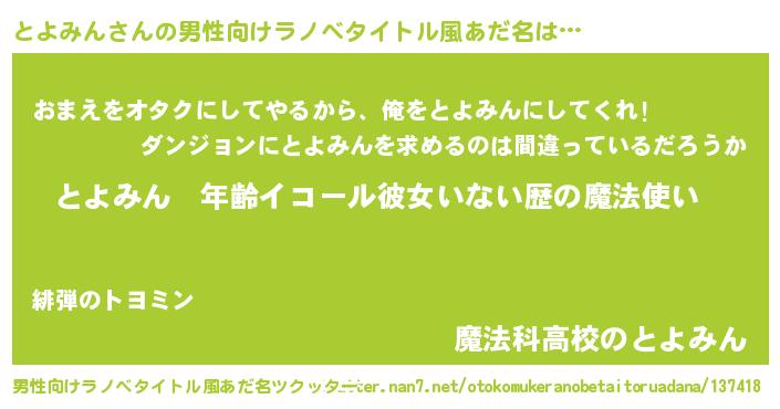 | 女子向けラノベタイトル風あだ名 | 『とよみんの玉の輿計画!』 |