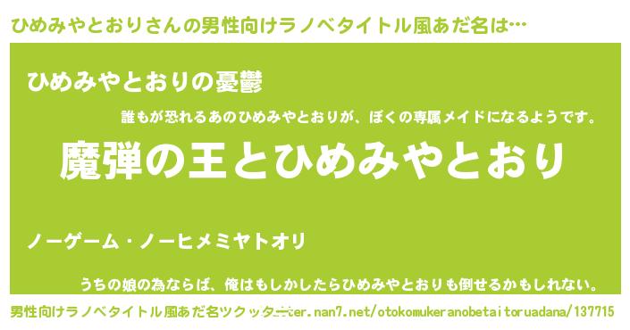 | ヒーロー風カッコイイあだ名 | 『仮面ヒメダー』『ネオヒメミヤトオリ』 |