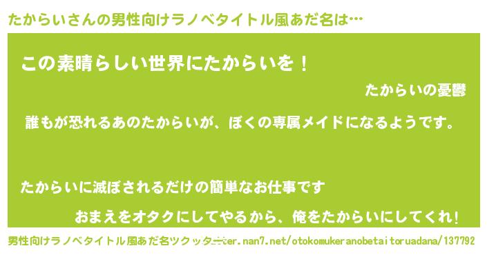 | ヘコむあだ名 | 『たからい(小並感)』『たかにゅー』 |