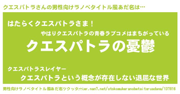 | ヘコむあだ名 | 『クエにゅー』『クエスパトラ(笑)』 |