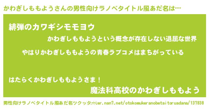 | 女子向けラノベタイトル風あだ名 | 『かわぎしももようの雑貨屋さん』 |