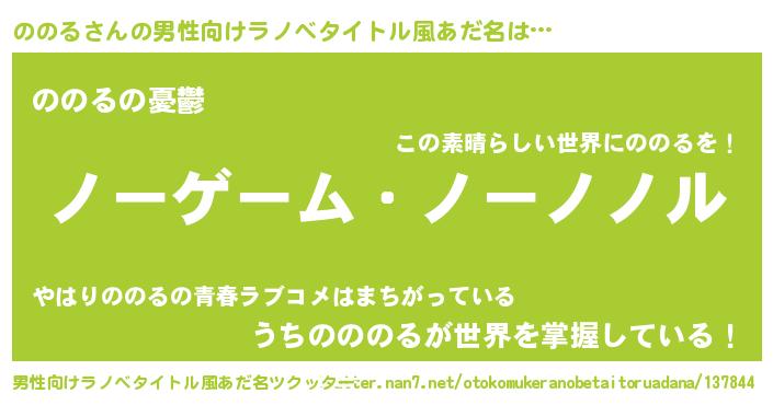| 女子向けラノベタイトル風あだ名 | 『死神ののるの再婚』 |