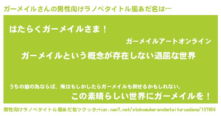 | 胡散臭い通販商品みたいなあだ名 | 『絶対に幸福をもたらす水素水…その名も「ガーメイル」』 |