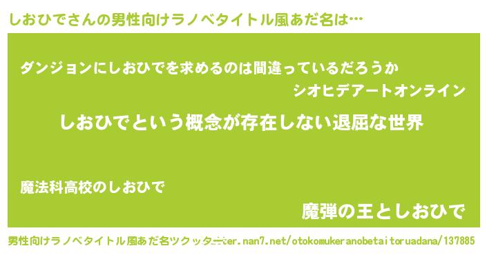 | 女子向けラノベタイトル風あだ名 | 『異世界で失敗しない100のしおひで』 |