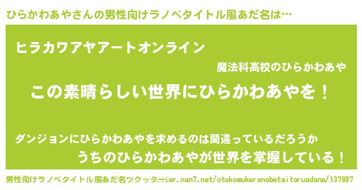 | 女子向けラノベタイトル風あだ名 | 『悪役ひらかわあやに転生したようですが、知った事ではありません』 |