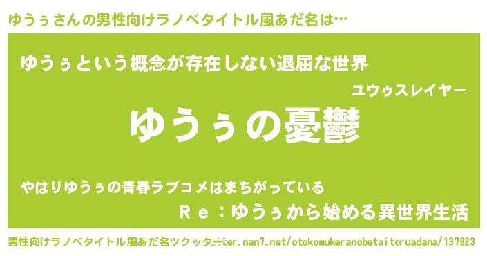 女子向けラノベタイトル風あだ名 | 『(仮)ゆうぅのやんごとなき事情』 |