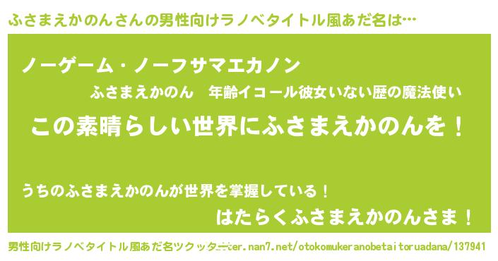 | 胡散臭い通販商品みたいなあだ名 | 『あなたにだけ特別に提供する100年もののヴィンテージワイン…その名も「ふさまえかのん」』 |
