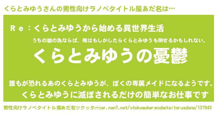 | 胡散臭い通販商品みたいなあだ名 | 『モテモテ間違いなし霊験あらたかなお札…その名も「くらとみゆう」』 |