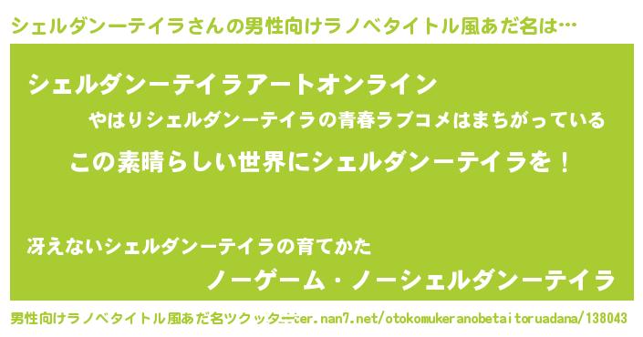 | 胡散臭い通販商品みたいなあだ名 | 『あなたにだけ特別に提供する世界で10本だけ現存している希少なブランデー…その名も「シェルダンーテイラ」』 |