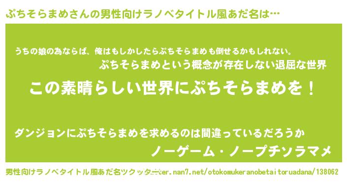 | 女子向けラノベタイトル風あだ名 | 『乙女ゲームの破滅フラグしかない悪役ぷちそらまめに転生してしまった…』 |