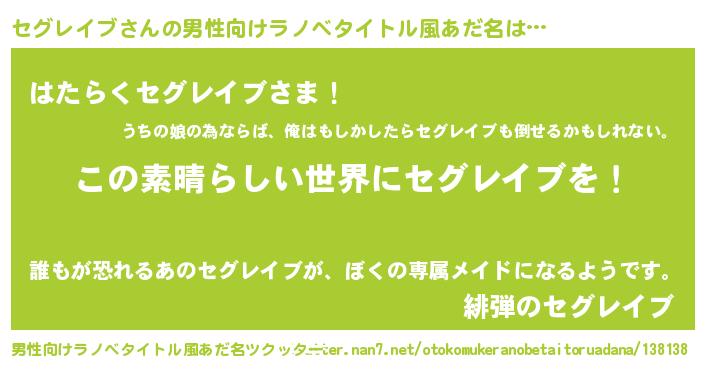 | 女子向けラノベタイトル風あだ名 | 『悪役セグレイブに転生したようですが、知った事ではありません』 |