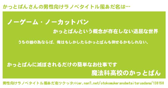 | 女子向けラノベタイトル風あだ名 | 『かっとぱん伯爵の花嫁』 |