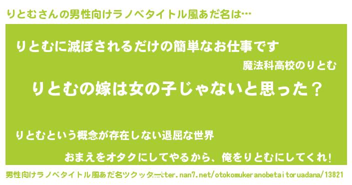 | 女子向けラノベタイトル風あだ名 | 『りとむの卵を拾いまして』 |