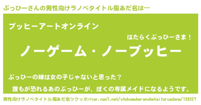 | 女子向けラノベタイトル風あだ名 | 『死神ぶっひーの再婚』 |