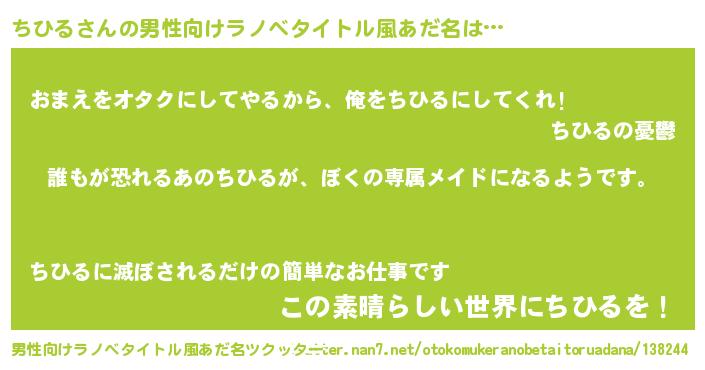 | 女子向けラノベタイトル風あだ名 | 『異世界でカフェちひるを開店しました。』 |