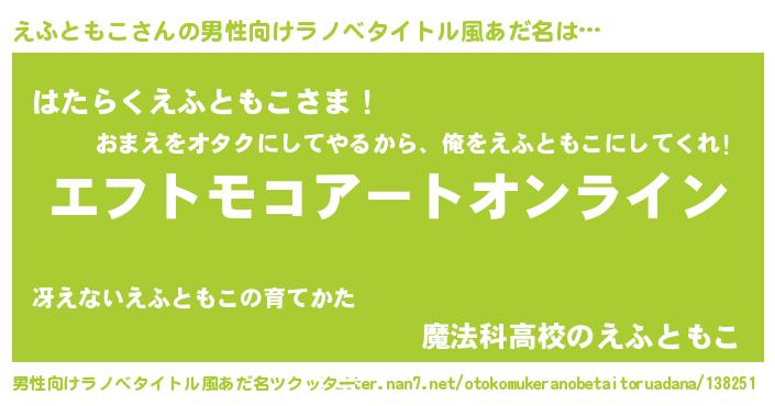 | 女子向けラノベタイトル風あだ名 | 『誰かこのえふともこを説明してください! ~契約から始まるウェディング~』 |