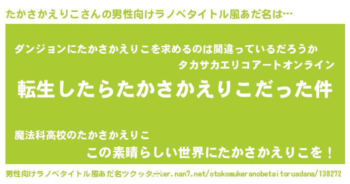 | 女子向けラノベタイトル風あだ名 | 『婚約破棄系悪役たかさかえりこに転生したので、保身に走りました。』 |