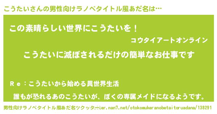 | 胡散臭い通販商品みたいなあだ名 | 『あなたにだけ特別に提供する限定10本のレアな日本酒…その名も「こうたい」』 |