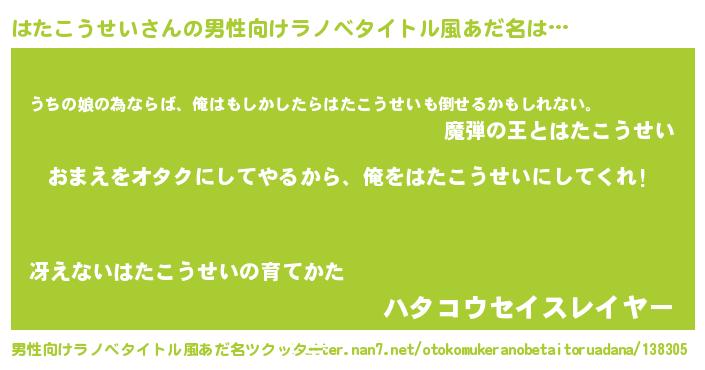 | 女子向けラノベタイトル風あだ名 | 『はたこうせい夫妻のなれそめ』 |