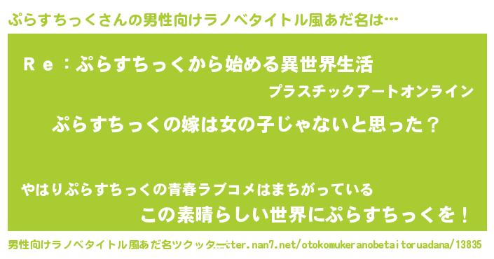 | 女子向けラノベタイトル風あだ名 | 『ぷらすちっくの卵を拾いまして』 |
