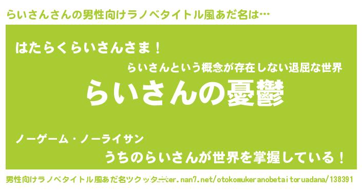 | 女子向けラノベタイトル風あだ名 | 『(仮)らいさんのやんごとなき事情』 |