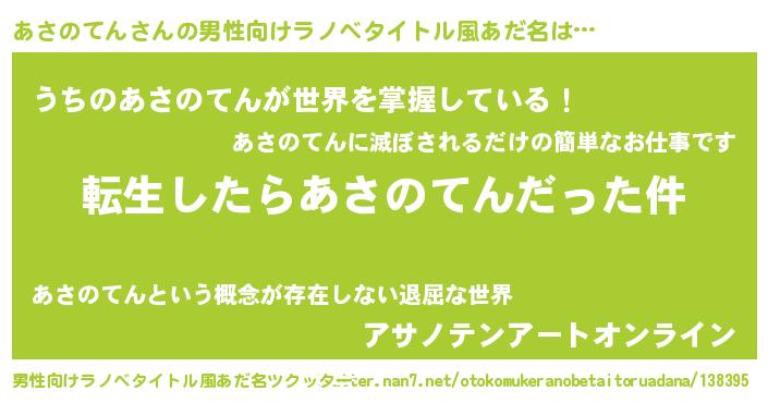 | 女子向けラノベタイトル風あだ名 | 『婚約破棄系悪役あさのてんに転生したので、保身に走りました。』 |