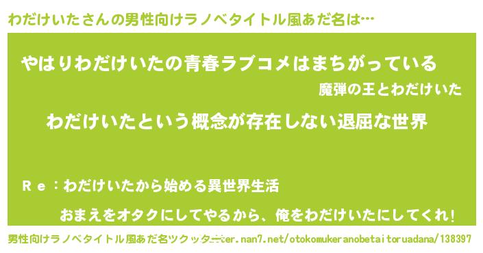 | 胡散臭い通販商品みたいなあだ名 | 『絶対に幸福をもたらす水素水…その名も「わだけいた」』 |