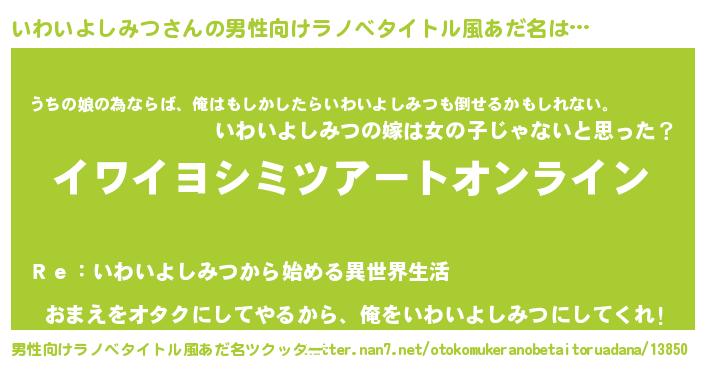 | 女子向けラノベタイトル風あだ名 | 『いわいよしみつ姫と円卓の騎士』 |