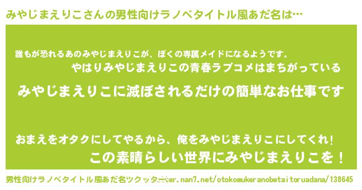 | 胡散臭い通販商品みたいなあだ名 | 『来世でも幸せになれる健康食品…その名も「みやじまえりこ」』 |