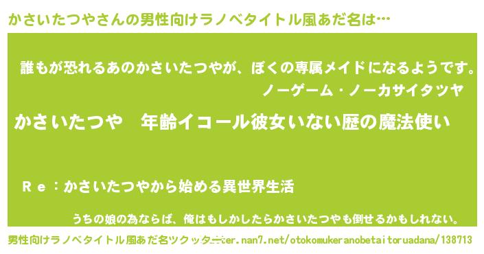 | 女子向けラノベタイトル風あだ名 | 『かさいたつやの玉の輿計画!』 |