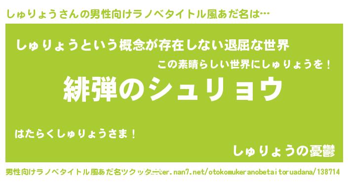 | 胡散臭い通販商品みたいなあだ名 | 『絶対に幸福をもたらす水素水…その名も「しゅりょう」』 |