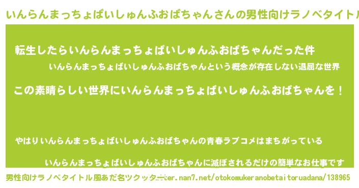| 胡散臭い通販商品みたいなあだ名 | 『あなたにだけ特別に提供する100年もののヴィンテージワイン…その名も「いんらんまっちょばいしゅんふおばちゃん」』 |
