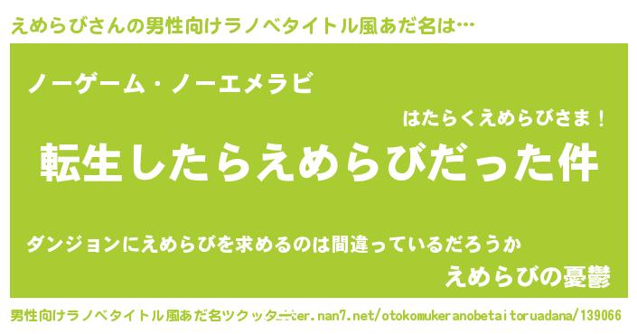 | 女子向けラノベタイトル風あだ名 | 『婚約破棄系悪役えめらびに転生したので、保身に走りました。』 |