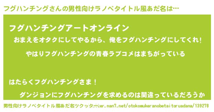 | 女子向けラノベタイトル風あだ名 | 『フグハンチング伯爵の花嫁』 |