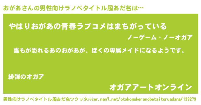 | 女子向けラノベタイトル風あだ名 | 『異世界でカフェおがあを開店しました。』 |