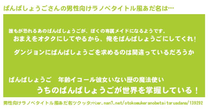 女子向けラノベタイトル風あだ名 | 『ばんばしょうごの卵を拾いまして』 |